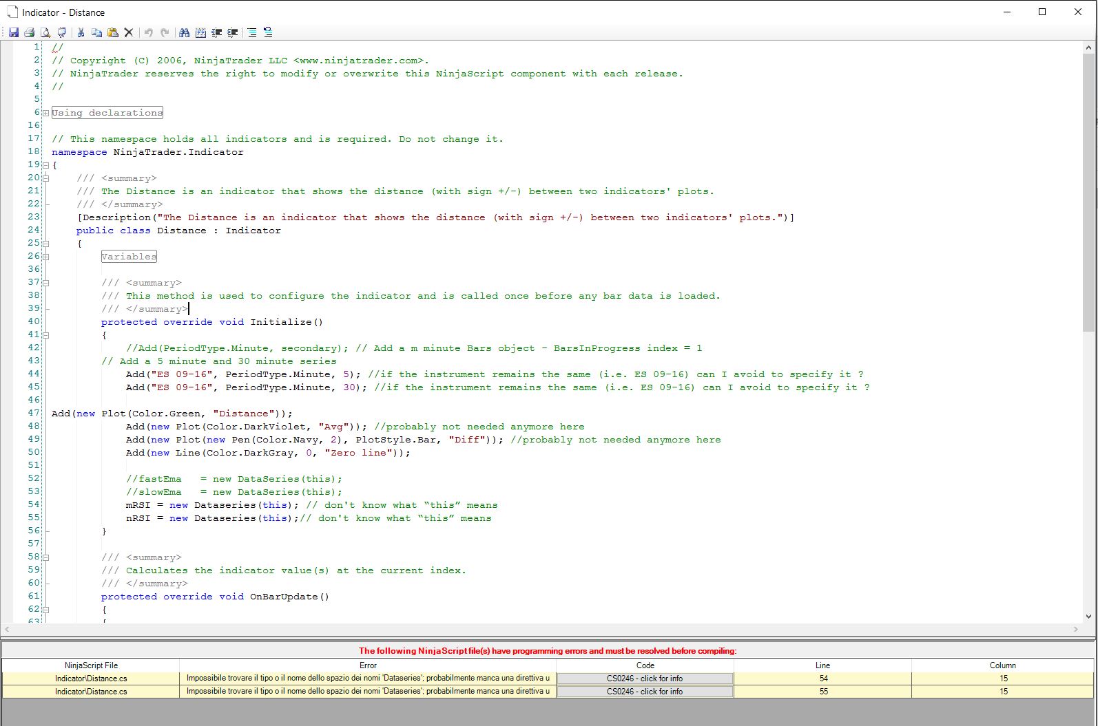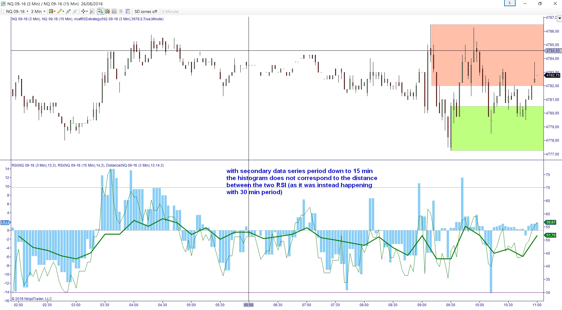 I then tried to modify it in order to have it using by default the primary instrument also for the secondary series (which however at this stage should not be used, since the "distance" is calculated just between two oscillators (two RSIs), for the same instrument (the primary one), but with two different periods, (do you agree? I am not so sure about all this). However after this modification, aiming to having the oscillators (the two RSIs) calculated on the NQ, the indi does not appear anymore on the chart. I do not understand where the mistake is.