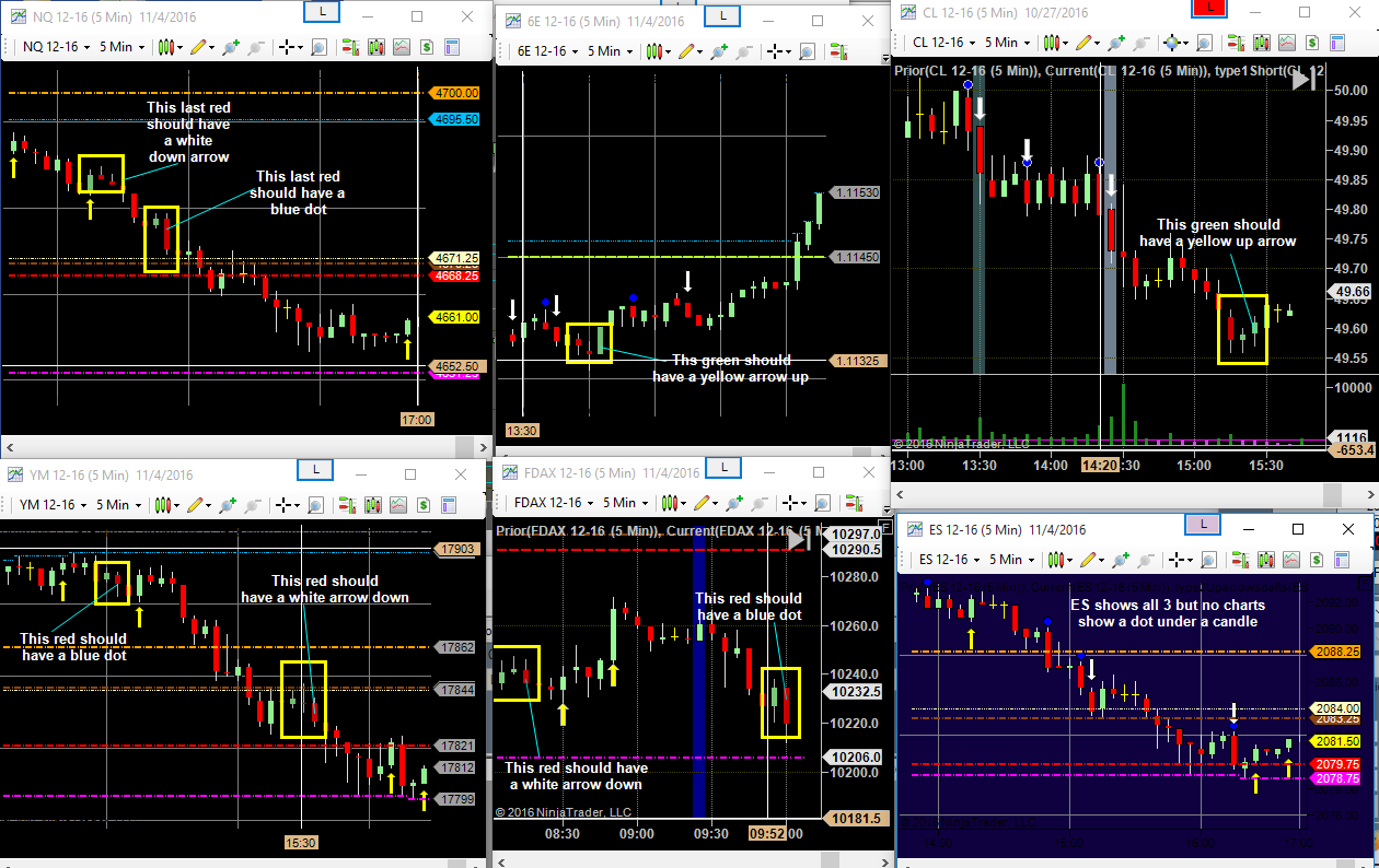 Regarding, "On charts with CL on top and ES below,, CL shows up and down versions but ES only shows down arrows.?" Is it possible that the chart scaling is not showing the arrows below price? Can you change the vertical scale to see if arrows are just off the chart view?