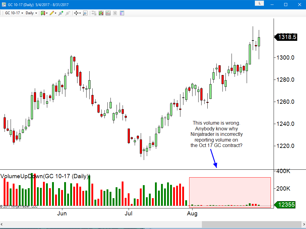 Well, of course changing the contract to Dec will fix the problem. The point was that Ninjatrader screwed up the volume on the then-active contract, the 10-17 contract. We wanted NT to fix the problem on what was the current contract, not just wait until gold rolled over to the next contract. Capiche? IMHO, this sort of problem with wildly incorrect data happens WAY too often on Ninjatrader.