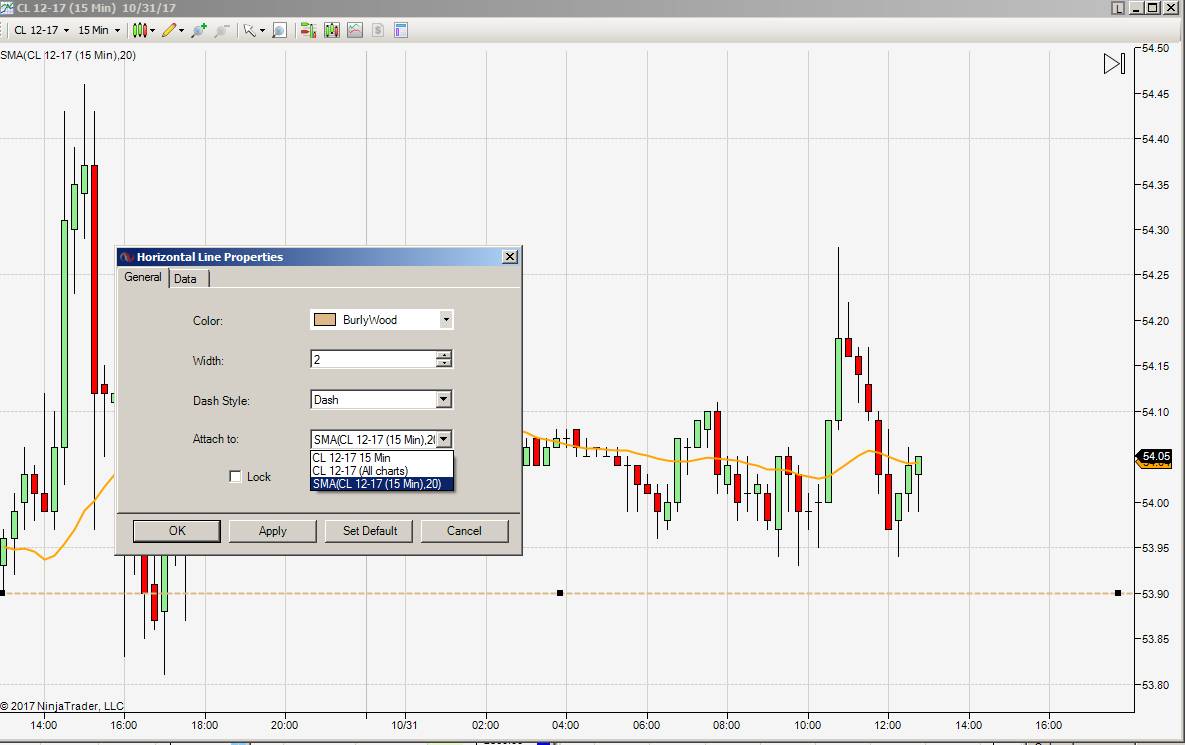"Attach to:" When I chose ...(All Charts) the line appears in all the charts which I may have open for that instrument. Sofar so good.
