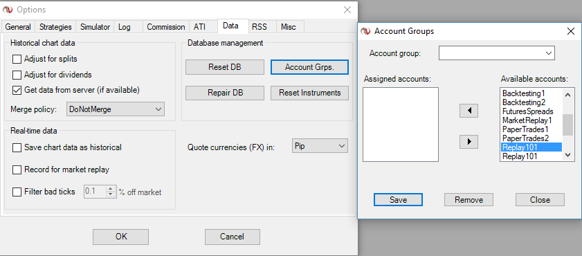 I tried to remove the duplicate Replay and SIM accounts that I found after going into Tools > Options > Data > Account Groups, but when I selected the duplicate account and pressed the Remove button, nothing happened.