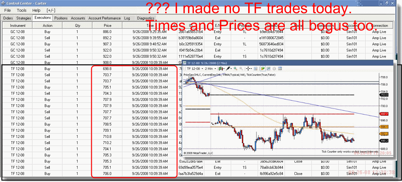 When I looked on the executions tab of the control center there were nine trades with all the same time stamp and at prices that had not been touched! I have never even touched a "strategy" so that is not it. I did have a TF chart open... I have never seen this before in using NT for a year. Pic is attached.