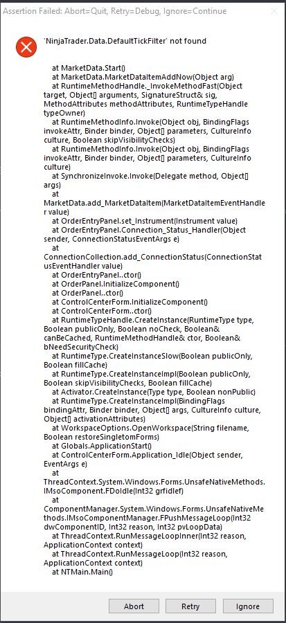 I am receiving the two errors when I open NT7 - both attached as snapshots, and I cannot get to the control center window. I believe this came about when I tried to download a ninjascript indicator, I received an error - below. to fix this error, I deleted all of the .cs files in my bin/custom folder, and I may have deleted additional files leading to the errors I receive at startup. I tried removing NT7 from "Add/Remove programs" and re-downloading it, and I still received these errors.