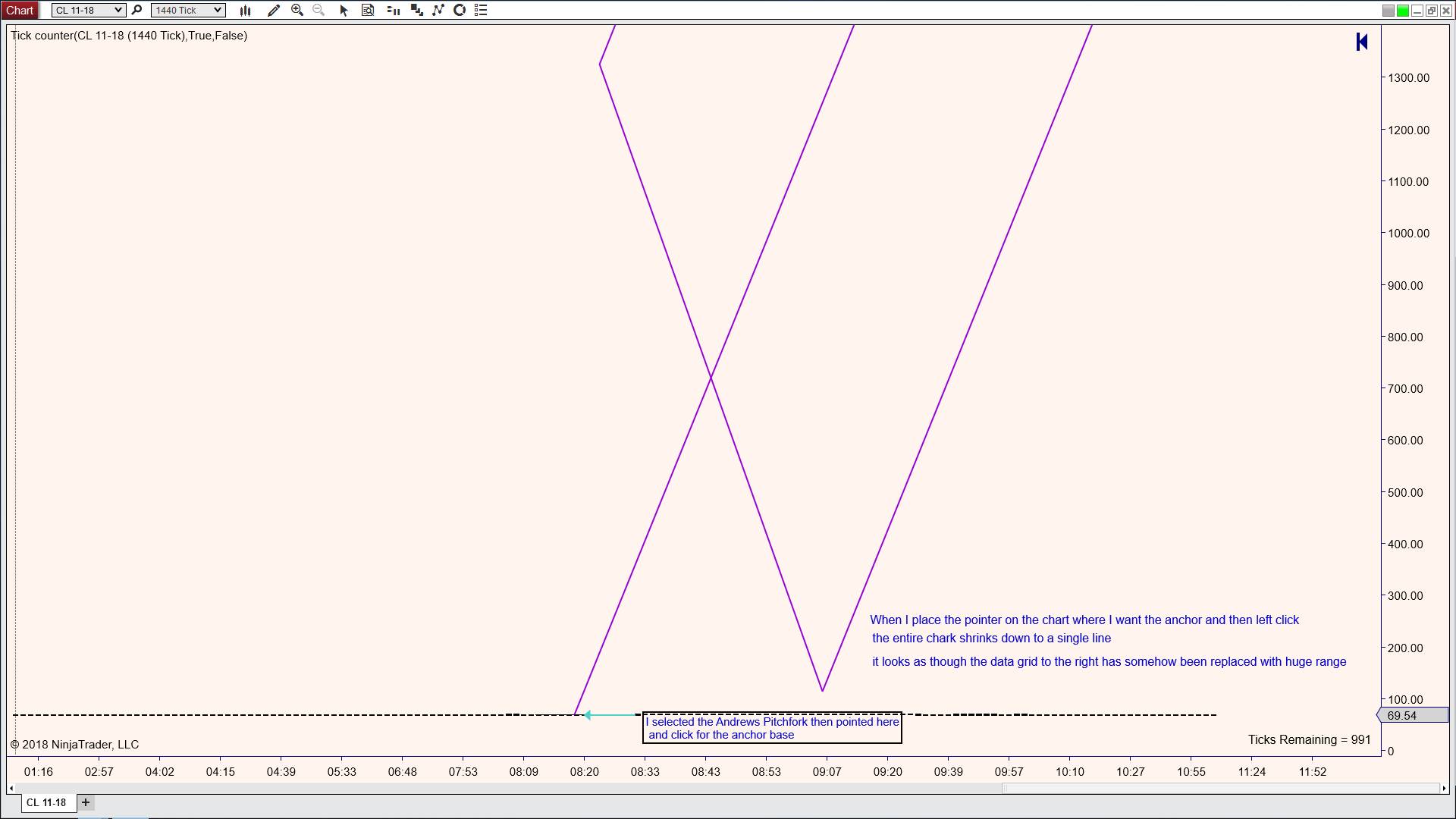 I downloaded Ninja 8 yesterday to determine if all the features that I normally use with the current Ninja 7 would work okay. I opened up a crude oil chart and tested all the drawing tools. All worked except for the Andrews Pitchfork. If I have a chart up, and select the pitchfork tool, and place the pointer where I want to start the pitchfork, everything seems fine until I actually left click the mouse. What happens is that the entire chart shrinks into one line across the screen. If you look at the vertical price grid on the right side of the screen, the range has changed to great big numbers. The trend tool works fine as do line,ray,fibo retrace,etc etc. The tool that I use most of all is the pitchfork. Any ideas?Tags: None