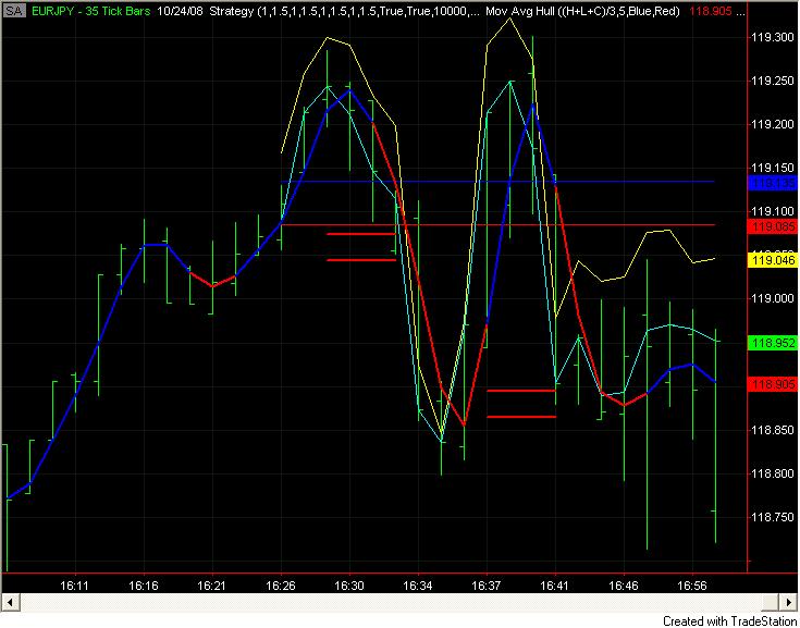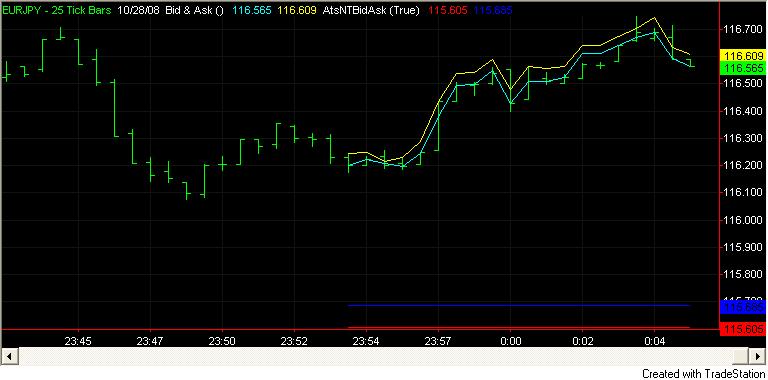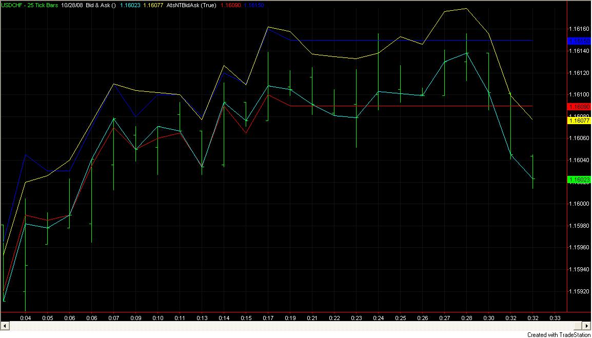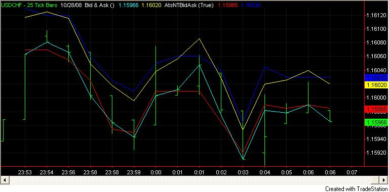 Attached are an image of one chart working (USDCHF) and another one not (EURJPY). The red/blue line is the bid/ask from IB thru NT. The yellow/cyan is the bid/ask from TS. I only have 3 charts open at the moment.