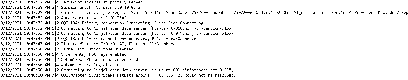 I looked at the log which read: CQG.Adapter.SubscribeMarketDataResolve: F.US.LBS.F21 could not be resolved.