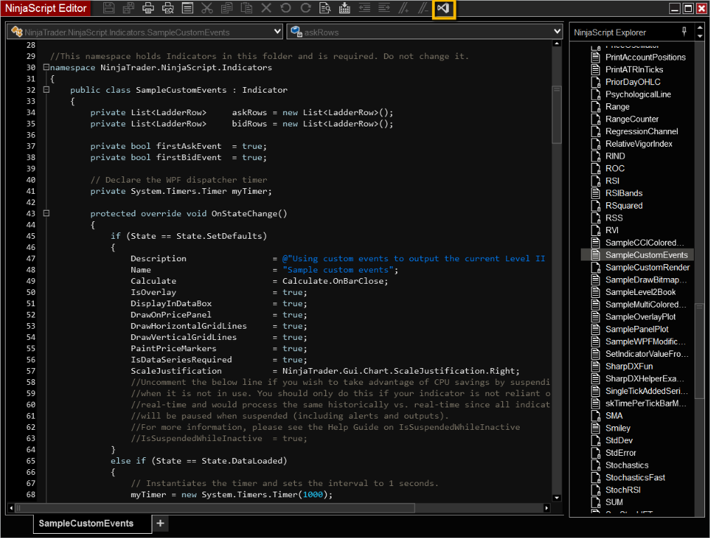 See this help guide documentation for detailed steps on editing/debugging a NinjaScript in Visual Studio: https://ninjatrader.com/support/help..._debugging.htm