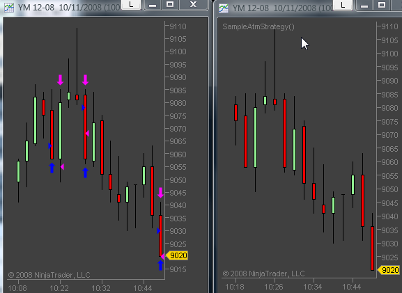the only difference in the charts below is that one has no strategy running and the other has SampleAtmStrategy running...which is generating the trades