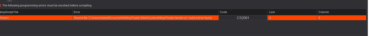 Im randomly running into this issue on NT8. it is saying it cant find Ninjatrader.vendor.cs file but its in that folder. i have been trying everything but am unable to resolve it.
