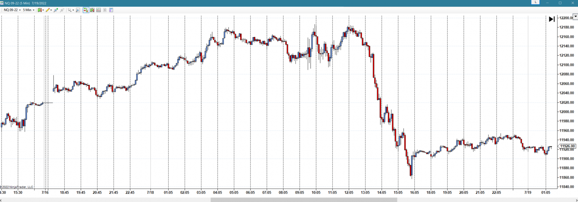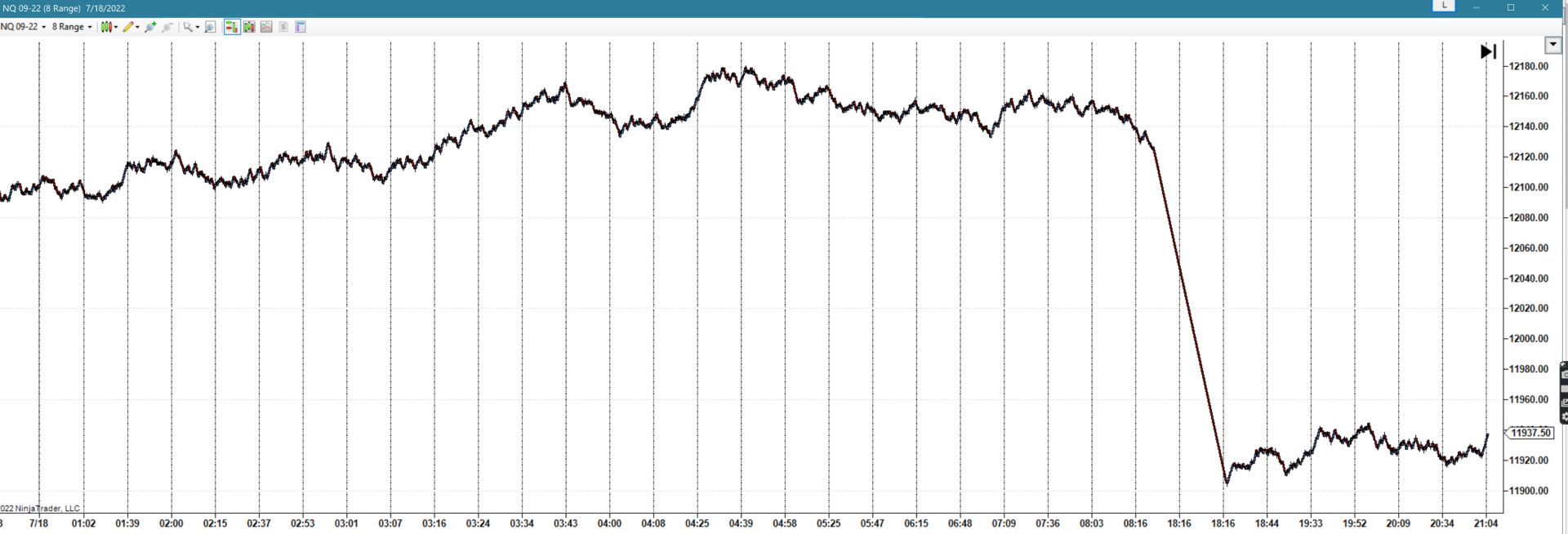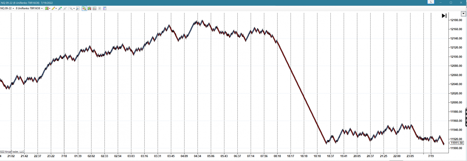 ok very strange, I got the 5 min to look correct for 7/18 for NQ 09-22 using all defaults, but my unirenko chart was completely wrong starting about 8:15am or open onwards, I then tried a basic 200 tick and 8 range chart same defaults as the 5 min and they show same problem as my unirenko charts. Not sure what is going on, in my 8 years on ninjatrader never seen this problem, see attached charts.
