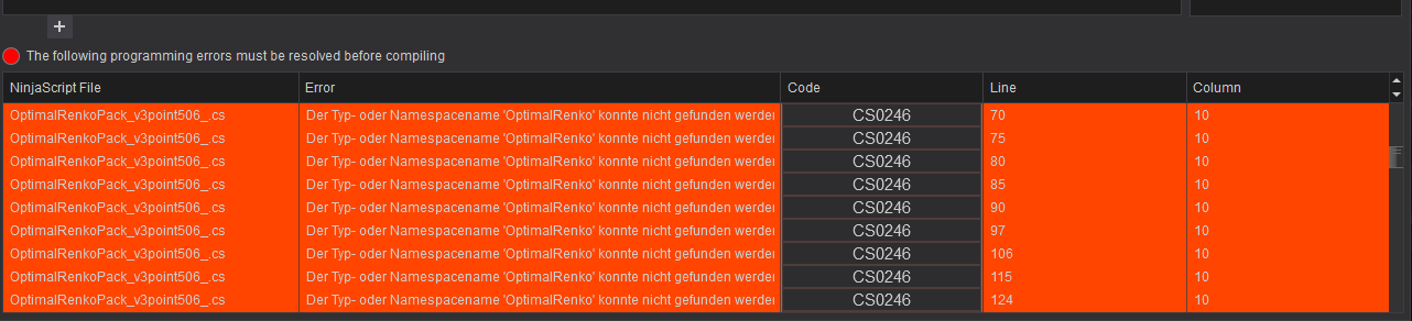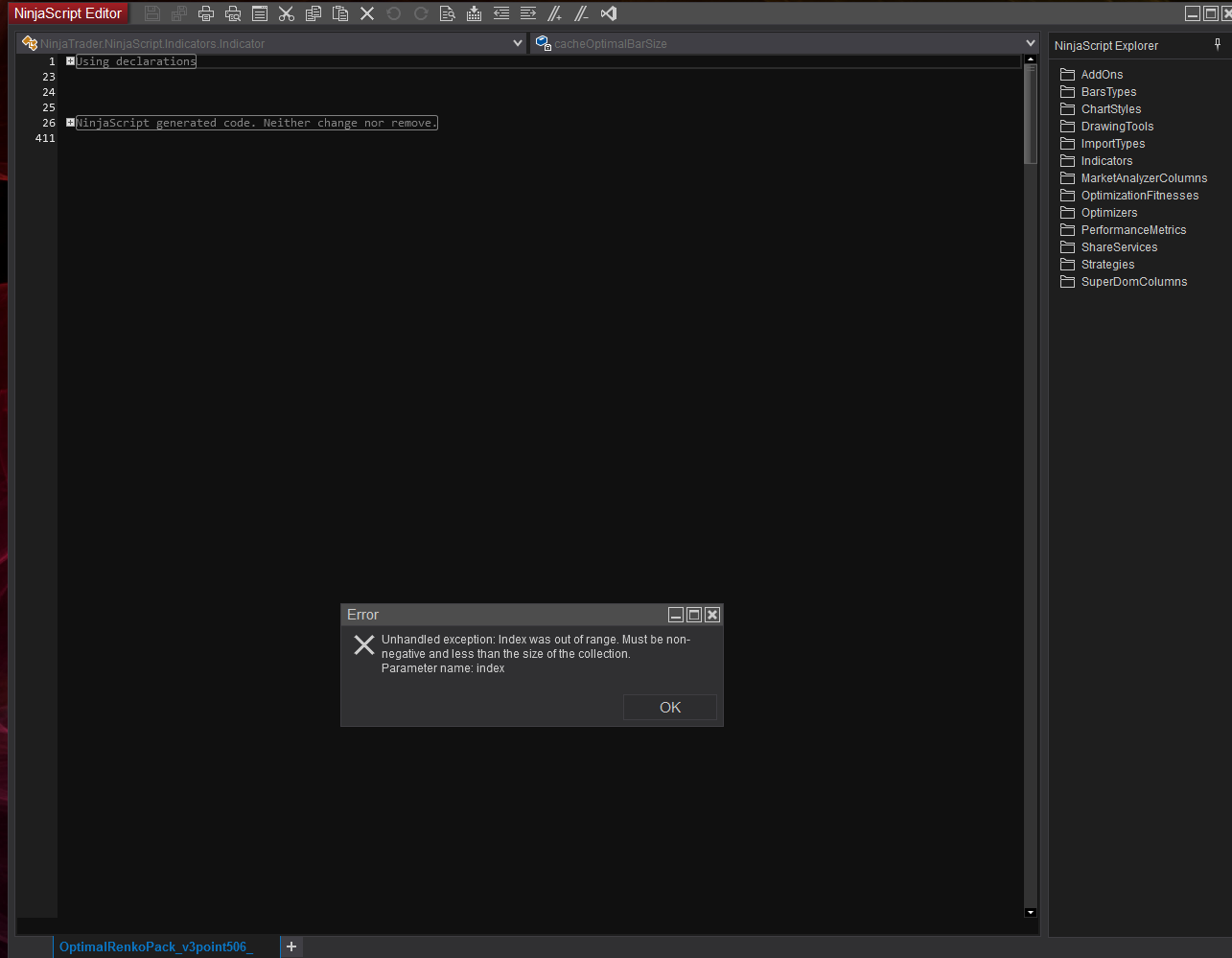 Hi Chidiroglou, thanks for posting. There is a missing reference to the "RenkoPack" dll. Right click>Go to Reference and add the reference to the dll. This index out of range error is different, if you are unable to use the NinjaScript Editor because of this error, start Ninjatrader in safe mode by closing the program, then hold Control on the keyboard and launch NInjaTrader again while holding Control. This will start up the program in safe mode, meaning a blank workspace will load, and no third party addons will load either. Fix the reference error from the NinjaScript editor while in safe mode. To resolve the index out of range error, we may need to connect through NinjaTrader. I can not tell where that is coming from.
