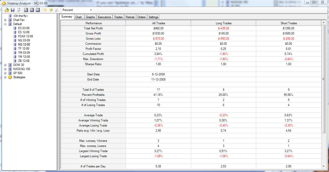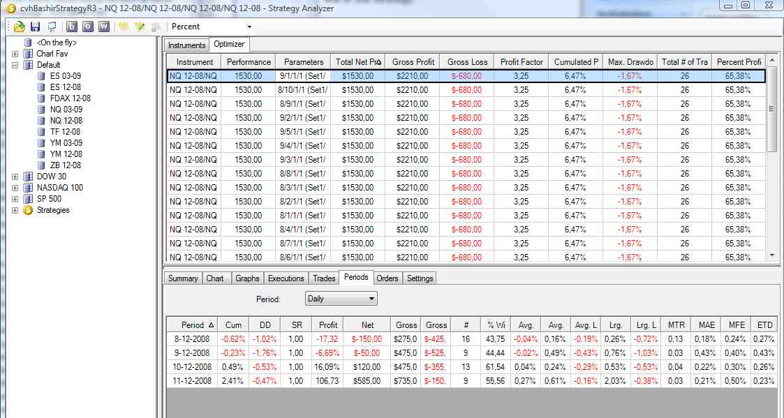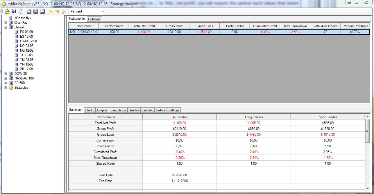 2) The results after running this strategy optimizer on the NQ. I see Total Net Profit displaying -$100, is that the best result this strategy could have? with the settings Set1=10 and Set2=10?
