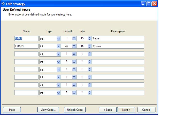 RJ, Thanks for the response however I think something else is going on as I have the value set to 9 see below. When I change the 15 value to 9 in the Parameters area it pops back to 15 as soon as I click in another field. BTW using your existing SMA crossover I was able to change the SMA period values and have it hold. Strangely enough if I change the EMA9 to a value larger than 15 it holds,, but any value less than 15 pops back to 15 --- weird!