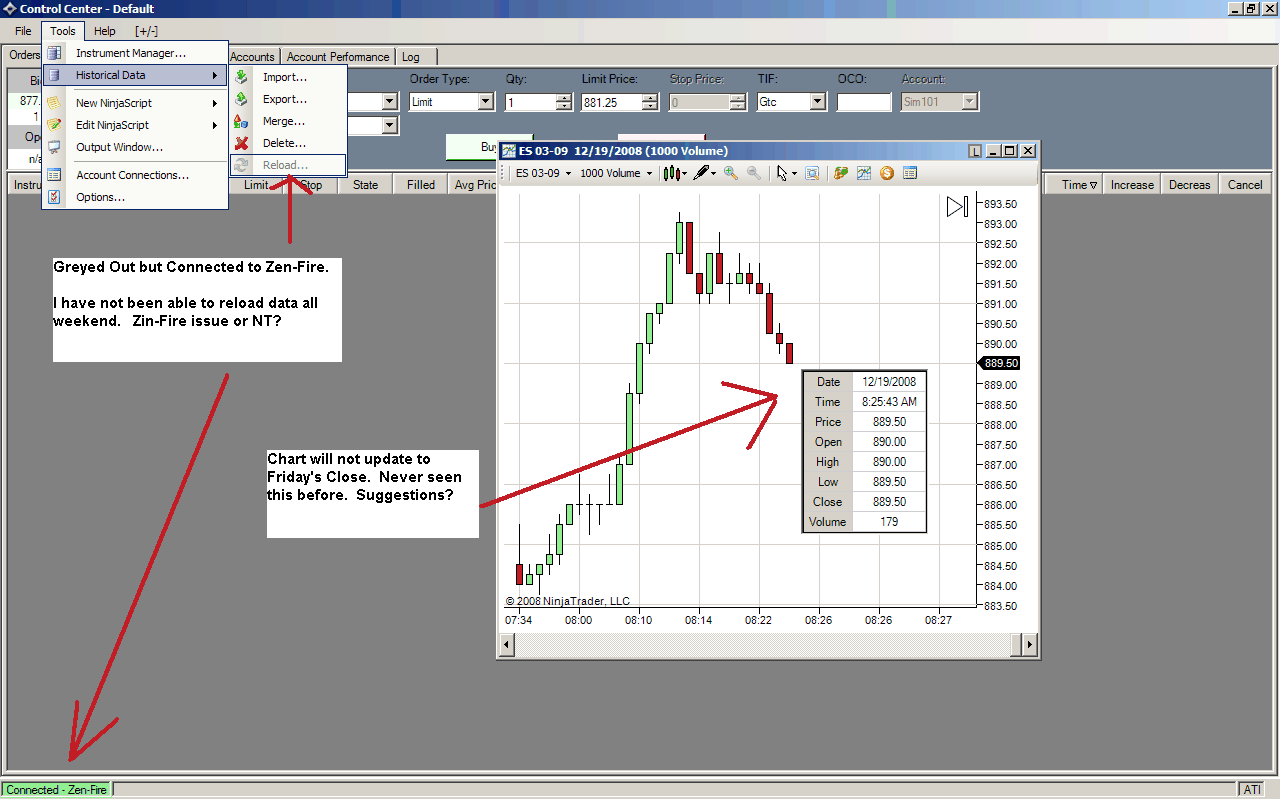 I have the option 'Enabled Historical Data' selected on the account. Yet when I connect and load a chart, like ES 09-08 for instance, I get nothing. Also the reload historical data option is grayed out. If I pull up ES 03-09 it works.