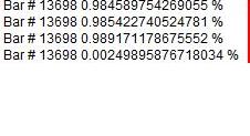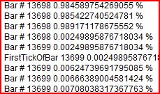 Before that, and before the new bar is processed, the PercentComplete value of the old bar suddenly drops. Here's the jpeg reduced to the essentials - only the old bar. The code Prints CurrentBar (#13698) and PercentComplete of CurrentBar.