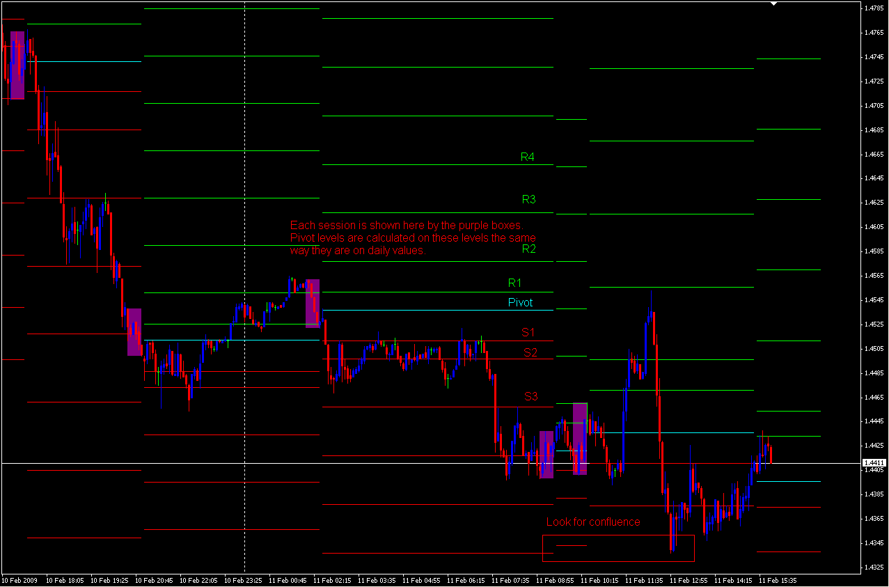 The user defines the start and end time of each session. The pivot levels are then calculated off of these sessions. The session pivot levels run from the end of the session to the end of the next session.
