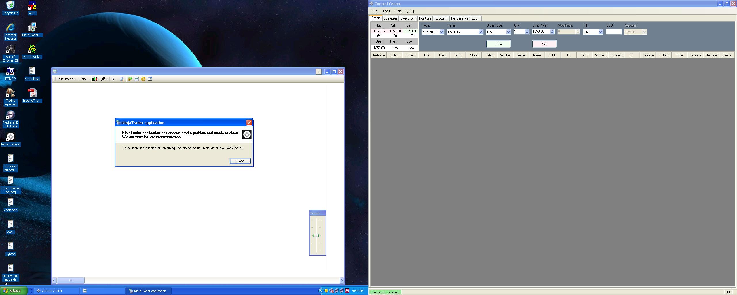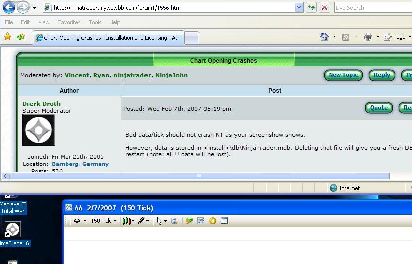 I have been trying to pull up a chart the the ES mini using 150 tick chart. That is the chart that had been crashing.Yet, when i change the chart to the stock symbol " AA " and use daily data, it does not crash. Could it be a out of range tick or bad data on the emini chart?