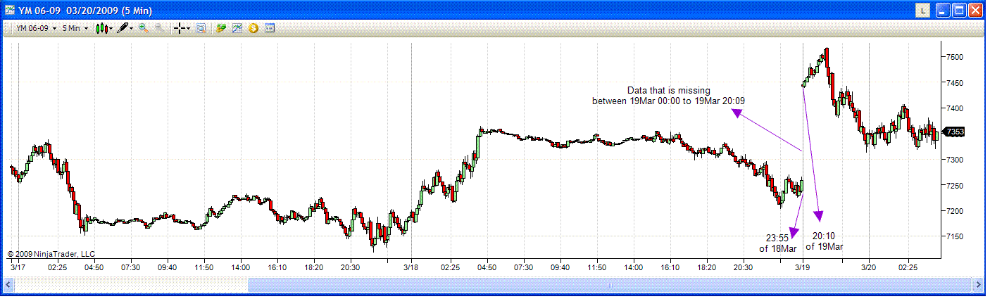 Open up a brand new chart for 3/16 - 3/19 and connect to the Market Replay connection for 3/20. Data from 20Mar 0:00 to 20:05 is not displayed.