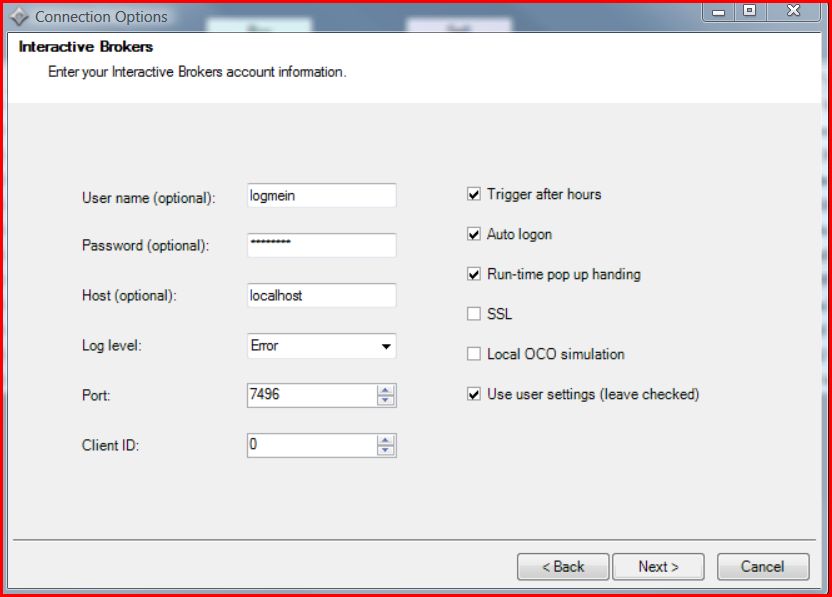 I am trying to set up a second IB account and cannot get both connections established at the same time. I believe I followed the instructions for setting up a second account (port # 4000 in second connection in both NT and TWS). I can connect to the first one, but then trying the second gives me the "Target machine actively refused..." error. I then close the first one and can connect to the second, but when I try to also connect to the first one I get that error again.