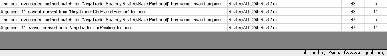 Please consult the docs: Print() accepts string, double, int and bool values but not type NinjaTrader.Data.MarketPosition nor NinjaTrader.Cbi.Position. You need to convert the information you want to print out to string or double or int or bool values.