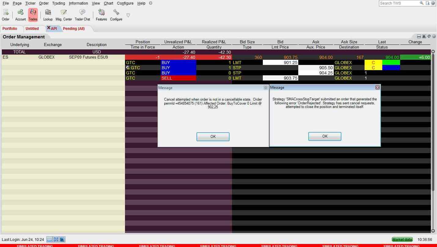 cesas, were you getting the same error codes as previously as you reduced your order size? Please test this with a as simple as possible strategy (SampleMACrossOver provided per default) and also enable TraceOrders in the Initialize() to debug this further - http://www.ninjatrader-support2.com/...ead.php?t=3627