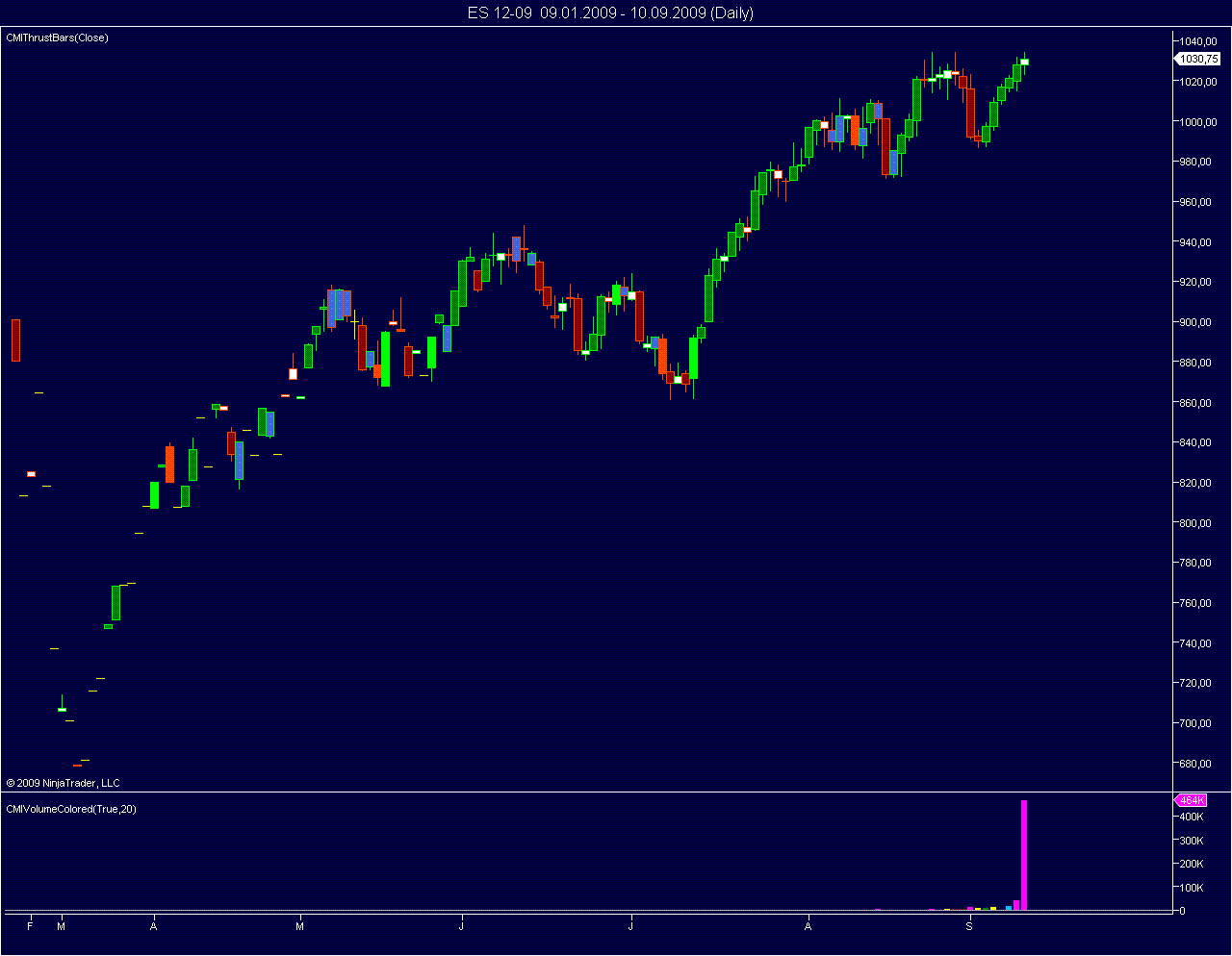 If you look at the 1440 min chart, you can see that the merging procedure was successful for intraday data. However the daily chart shows data that has not been merged (although my data base contains daily data of ES 09-09 many months back.
