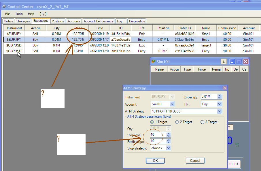 When I place a ATM scalp strategy for 10 pips profit and 10 pips loss as shown in the attachment, why do I get closed at when I'm 5 pips in profit or loss?