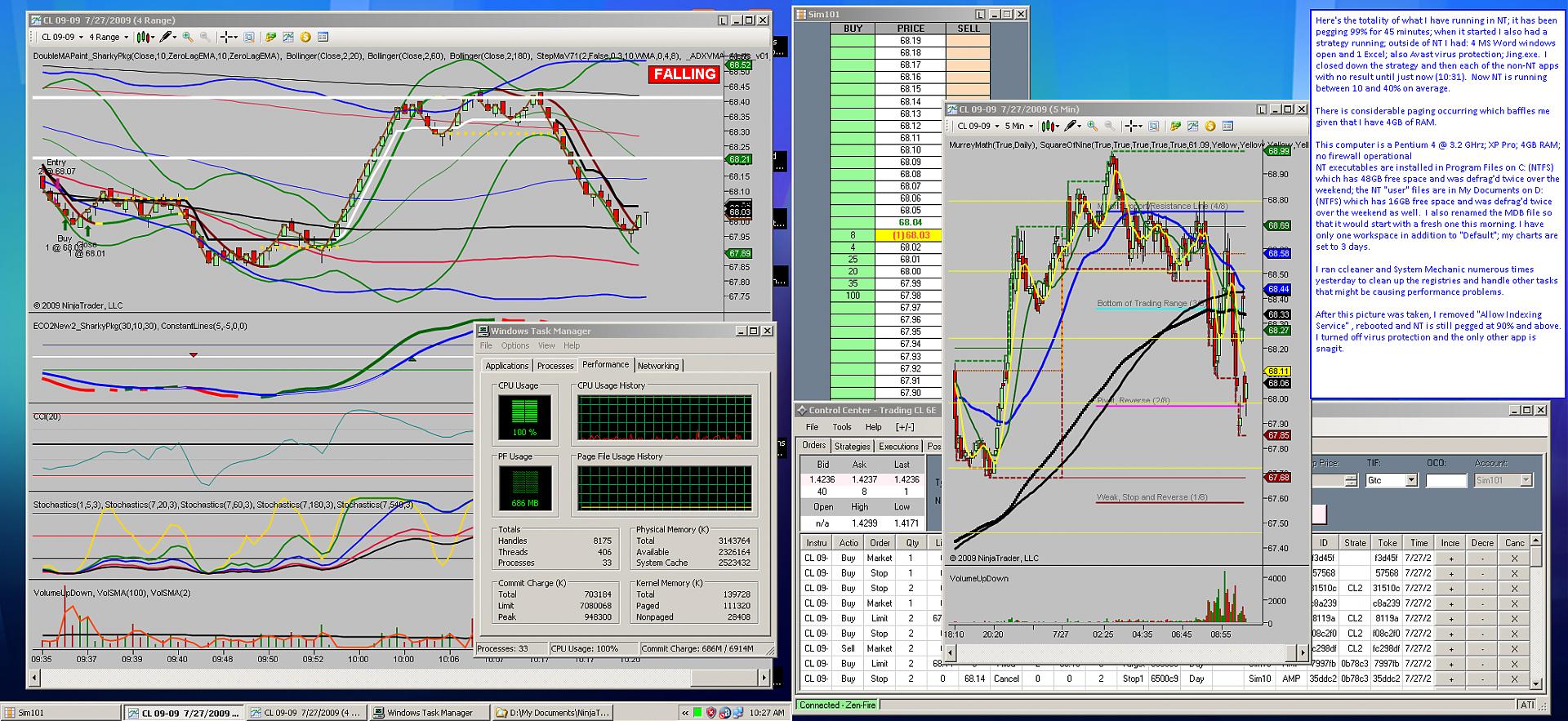 Here's the totality of what I have running in NT; it has been pegging 99% for 45 minutes; when it started I also had a strategy running; outside of NT I had: 4 MS Word windows open and 1 Excel; also Avast virus protection; Jing.exe. I closed down the strategy and then each of the non-NT apps with no result until just now (10:31). Now NT is running between 10 and 40% on average.
