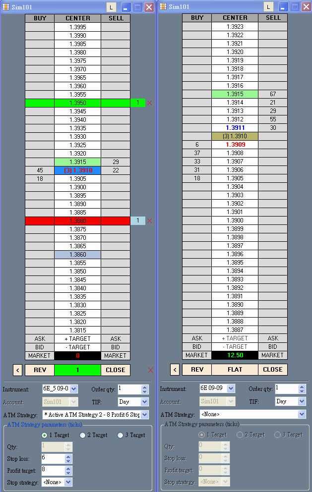 I want to know if I can have OCO on two separate SuperDOMs. e.g. in the following capture, I have two DOMs on the same instrutment 6E, but one is standard (0.0001) and one is 0.0005. If I have an active ATM with profit target and stop loss in force on the 0.0005 DOM, can I close the trade manually on the 0.0001 DOM and NT can cancel all the orders on the 0.0005 DOM automatically?Last edited by pipal; 07-09-2009, 12:22 AM.Tags: None
