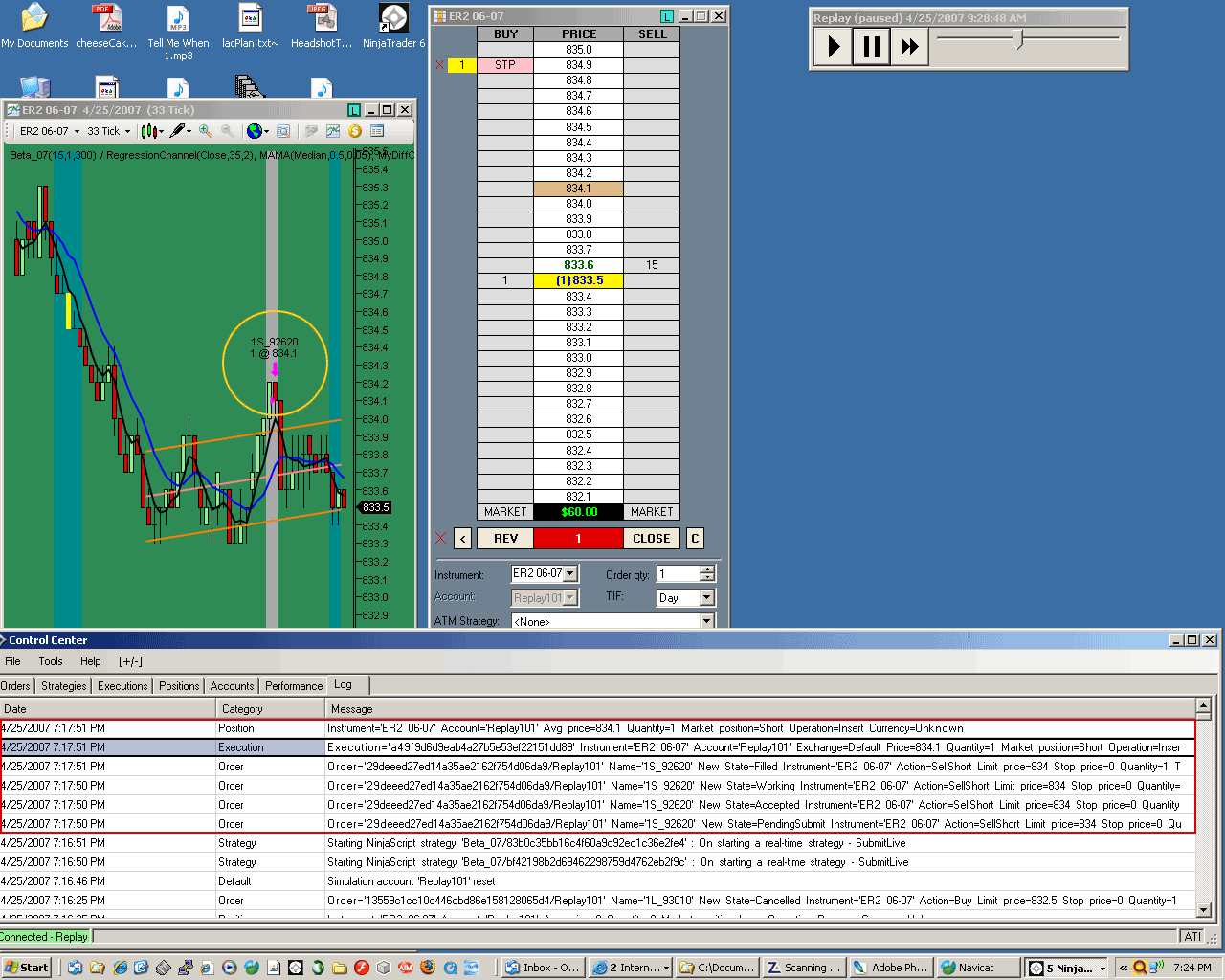 Entered internal PlaceOrder() method at 4/25/2007 1:30:00 PM: Action=SellShort OrderType=Limit Quantity=1 LimitPrice=835.8 StopPrice=0 SignalName=1S_133000' FromEntrySignal=''