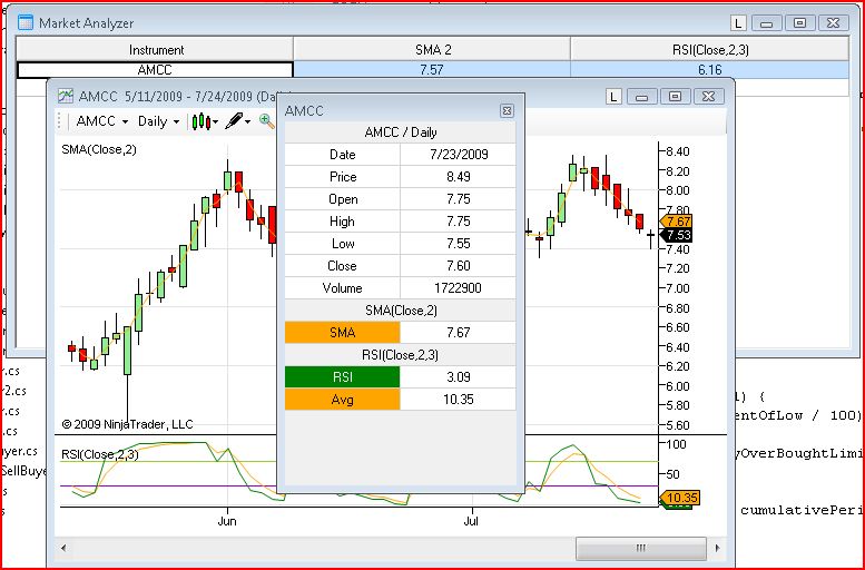 The values for the two columns are: SMA - 7.57 RSI - 6.16