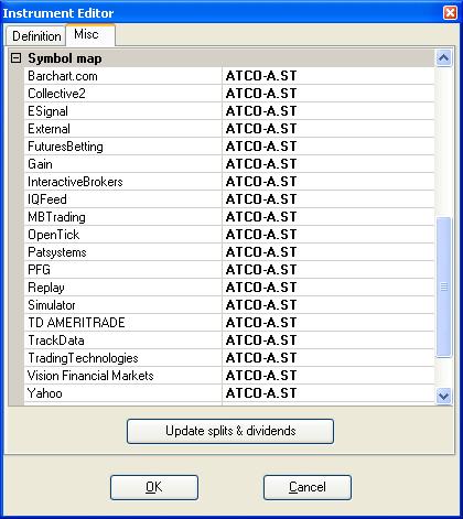 Thanks! I think I begin to understand how this works ;-) If I' got it right it doesn't matter what I write in the field "Master Instrument" as long as it doesn't contain a symbol like "-" or "^" that NT don't accepts. The important thing for the conection with Yahoo to work is that the correct Yahoo symbol for the actual instrument is enterd in the in the "Misc"-tab below the "Symbol map" hedline. In my case "ATCO-A".