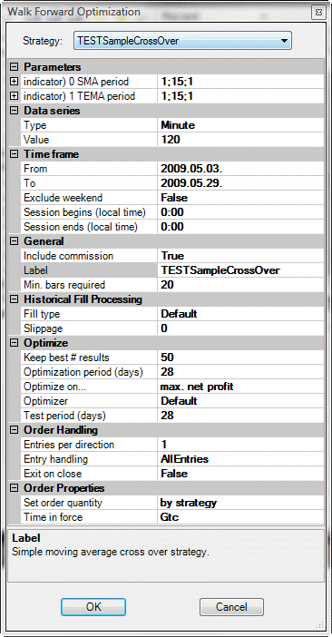 your strategy in Ititialize() method because you dont want to fill (From/To/etc) backtest form always, then Walkforward will run "incorrecty". The reason is that the above mentioned code during the initialization always overwrite the "Test period days" of Walkforward when it calls backtest. So pay attention on this.Code:BackTestFrom = new DateTime(2009, 5, 3); BackTestTo = new DateTime(2009, 5, 29); ExcludeWeekend = false; SessionBegin = new DateTime(1, 1, 1, 0, 0, 0); SessionEnd = new DateTime(1, 1, 1, 0, 0, 0);