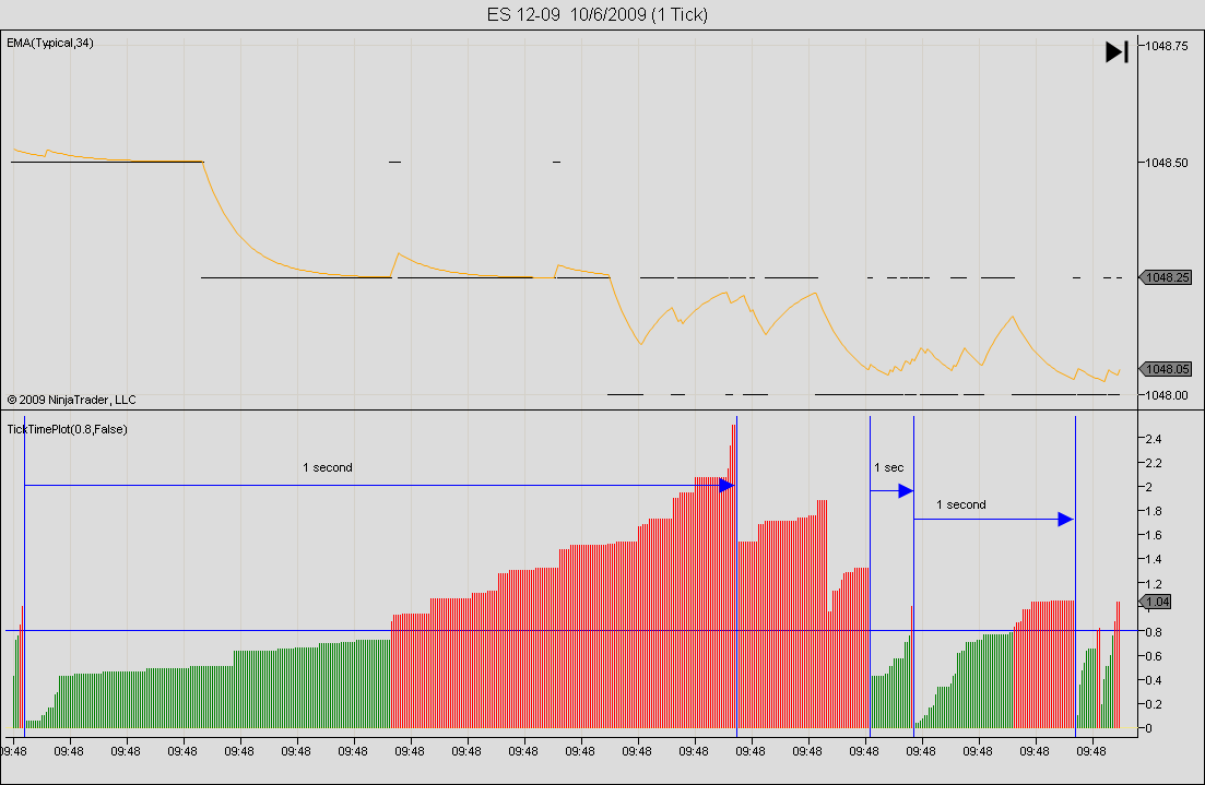The TTPv2 picture shows a modified version of TTP which, might prove a bit more accurate. Instead of averaging the ticks that occur throughout the 1 second interval, it takes just the first tick. While it's still not perfect (nor can be), it should be more accurate. It should be used on a 1 second chart.