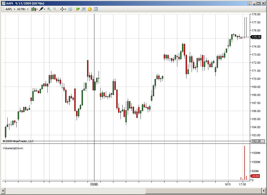 Still does not work. NT says that Apple did 1700M shares in after hours trading yet they only have 895M shares total. So unless someone purchased the company and then sold it to someone else I don't think this is correct. This volume problem occurs on each of my charts and is somewhat random in occurrence. Everything will be fine for 2 hours or so then randomly I will notice one of my charts with a huge bar. By the end of the trading day all of them have them. I am running windows server 2003 enterprise edition with 8Gigs of ram.