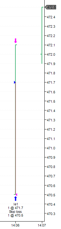However, look at how NT executed these fills. It put me long at 471.7 (correct) then stopped me out at 470.5 (suspect). For this to have actually happened, on the 14:06 bar the market would have had to trade up to at least 471.7 (long entry fill) then down to at least 470.5 (stop loss fill) then back up to 472.1 (the close).