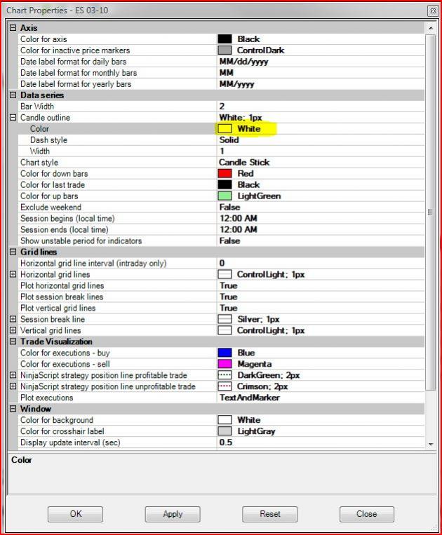Yes this can be done by changing the Candlestick outline color within the Chart Properties window. To access the properties window please right mouse click within your chart-->Properties.
