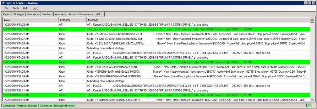 I have one single function in TS that creates and send the orders to NT. This function takes the price .xxxxx non JPY or .xxx JPY and calls the NT function NtCommand to send the order. I been doing this for two years sending orders for the 10 mayor pairs. I have send 10s of thousand orders to IB Live/Demo environments. I only have this problem with the USDCAD symbol. For example see my log from today attached.