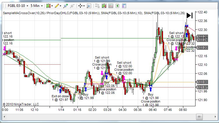 Originally posted by NinjaTrader_Austin View PostGoldStandard, when a NinjaTrader strategy is loaded on a chart it does exactly what you describe. The backtested strategy plots the historical trades right there on the chart. Attached is a screenshot of a strategy applied to a chart.