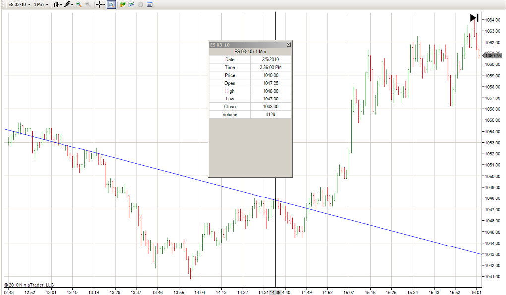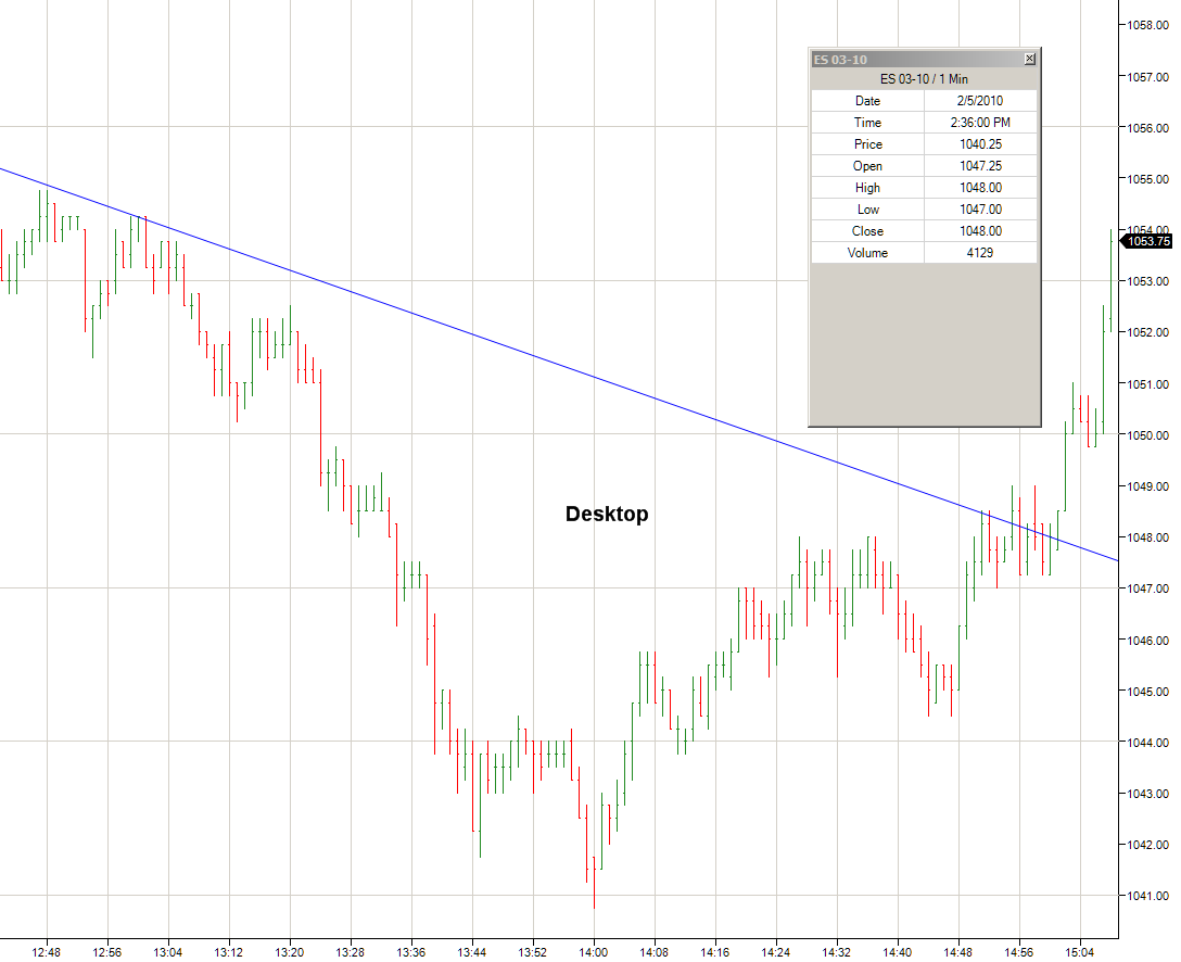 Attached are 2 charts, both of ES RTH 1min (02/04 to 02/05). One is a screencap from a notebook, and the other a desktop. A Ray drawn connecting the two leftmost highs do not extend/cross the later bars at the same price. This is despite 1) Resetting the DB on both PC's. 2) Reloading history after resetting (separately, and from the same data source) 3) Confirming that the anchor-highs are the same price on both charts/PC's 4) Snap to OHLC set ON on both charts when the Ray is drawn and confirmed via magnify that the correct highs are being used. 5) Verified that both PCs are using the same NT version (6.5.1000.14). Though the differences may look minor, they will increase the further the Ray extends to the right. Is this a bug, and if so, can it be fixed before ver 7 is released?Last edited by Tarkus11; 02-06-2010, 04:22 PM.Tags: None