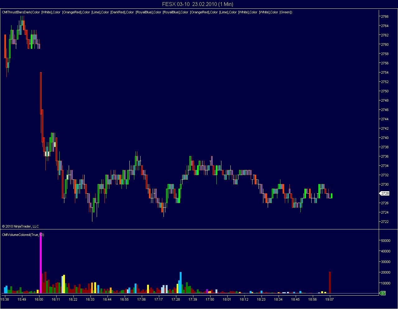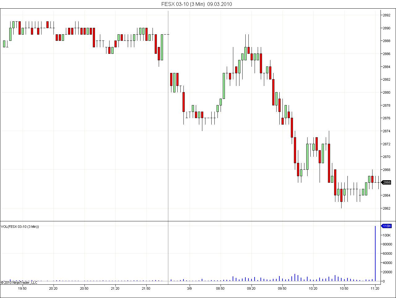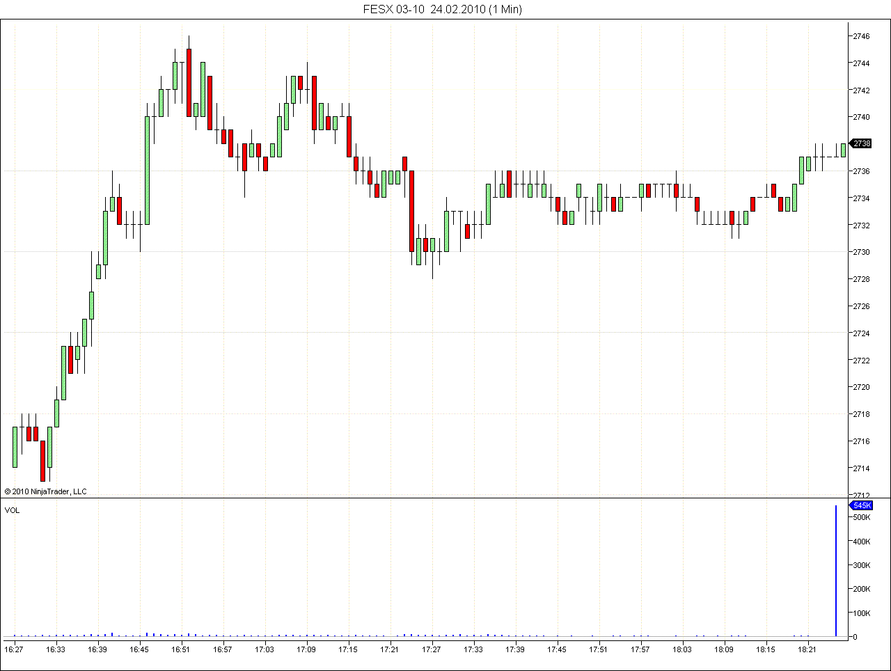 Opened a default 1 min chart for FESX. Added NT volume indicator. For about a second, volume was displayed correctly. Then it jumped up and remained as shown on the chart below.