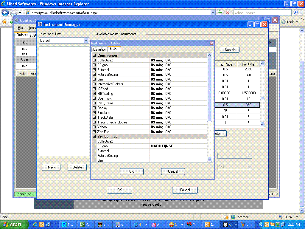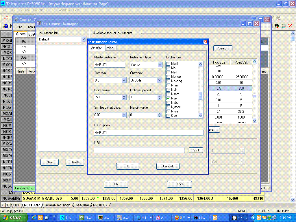 I am trying to load an instrument. it is a stock future listed at NSE. The e-signal symbol for this is MARUTI N7-NSF. I have tried to input all this information including the correct symbol but when i try to create a chart out of it. I get the message "need to select an instrument".