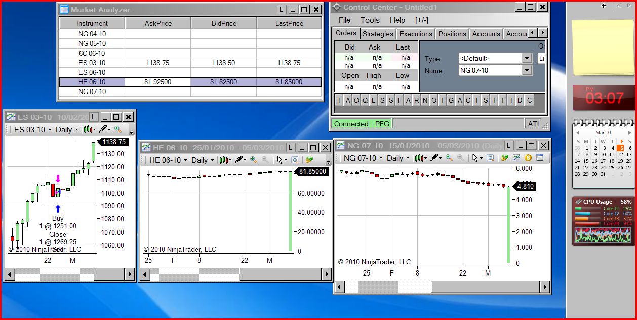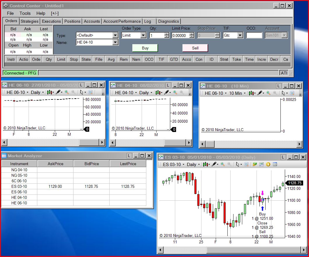 Instrument is HEM0 in PFG or HE 06-10 in NT. I got filled on a trade this morning, so wanted to look at the Daily chart (to set up a stop loss). Since I know Ihad a trade, I thought if I showed the 10 min chart it should be visible as well... not...