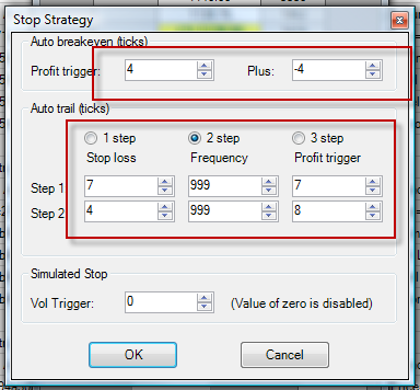 Here's the first one.... Trades 2 contracts. First Target is 4 ticks on 1 contract. Second target is set at 8 ticks. Once forst target is hit, I want the Stop to move to -4 ticks behind Entry price ( scratch ). When price moves to +7 ticks toward my second target, I want the stop to move to BE and leave it there. If price moves to 8 ticks ( Fill or Not ) I want the stop to go to +4 ticks above my Entry price and leave it there. Here's the Second strategy....... Trades 1 contract. Stop is 10 ticks, and the target is 6 ticks. Once price moves 6 ticks in my favor, I want the Stop to move to Entry +1 . Once it hits 7 ticks, I want it to move to +3 and stay there. From here, I want to be able to manual trail it as price moves in my favor. the goal on this strategy is a total of +24 ticks. Thanks for the help guys - MikeTags: None