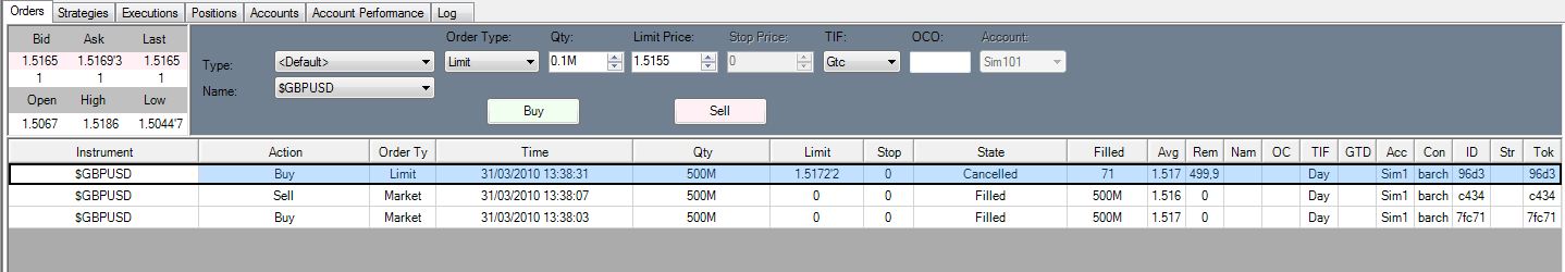When I place a market buy order by clicking on the "Market" button on the buy side of the ladder displayed in the DOM Window, the order gets filled almost immediately.