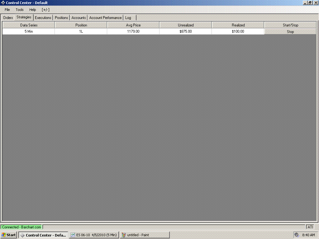 The only case when automated trading runs fine is when I start a strategy at the beginning of a session (12:01am) using just this (one) day for the data on the chart (so the strategy has no back data to establish "virtual position" of anything other than ZERO, as it only has 1 minute worth of back data on the start) and allow the strategy to trade market hours I DO NOT want to trade. OR set "minimum bars required" to 36 for 5 min chart to make it start actual trading at 4am. which is when I want it to start trading. In either case this means I can`t go to sleep but must wait for 12:01am to start the strategy.