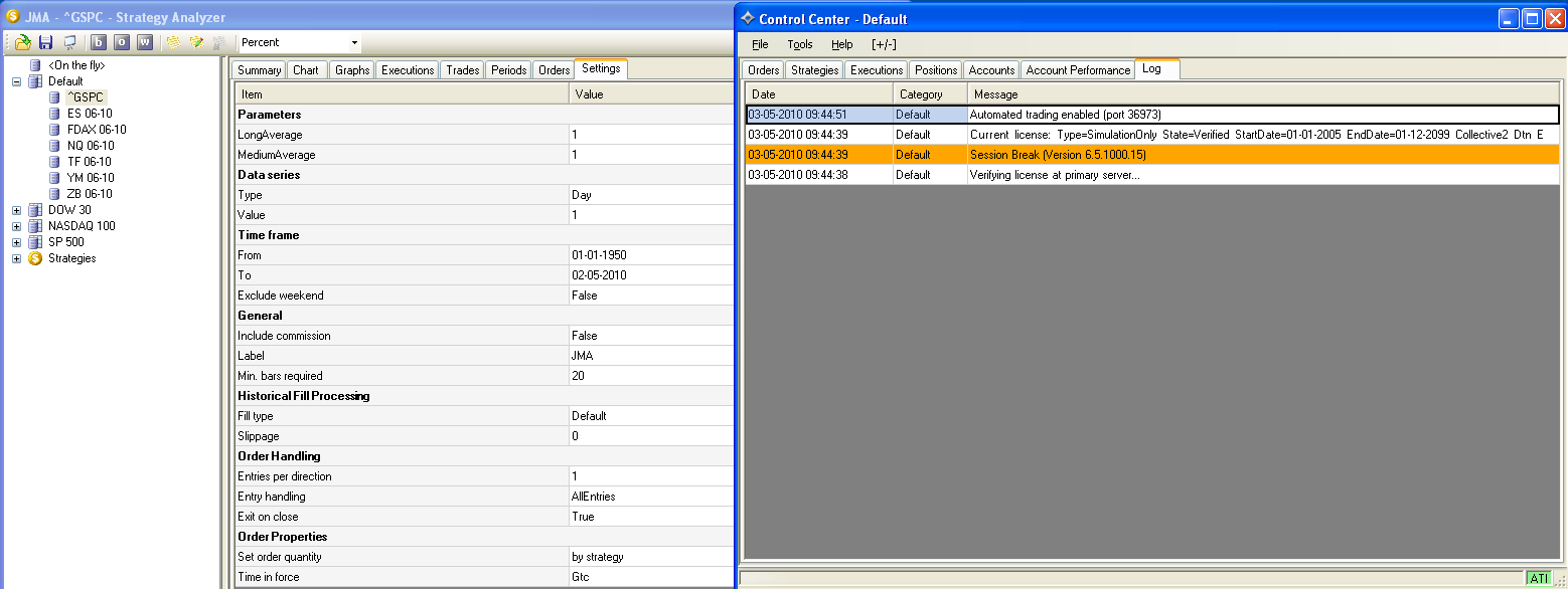 I have historical prices on SP500. If i put in 01-01-1950 as from date and 01-05-2010 as to date and then test a strategy notting appears on summary. Every thing is $0, but the Chart appears correctly, but there is no executions, trades or orders.