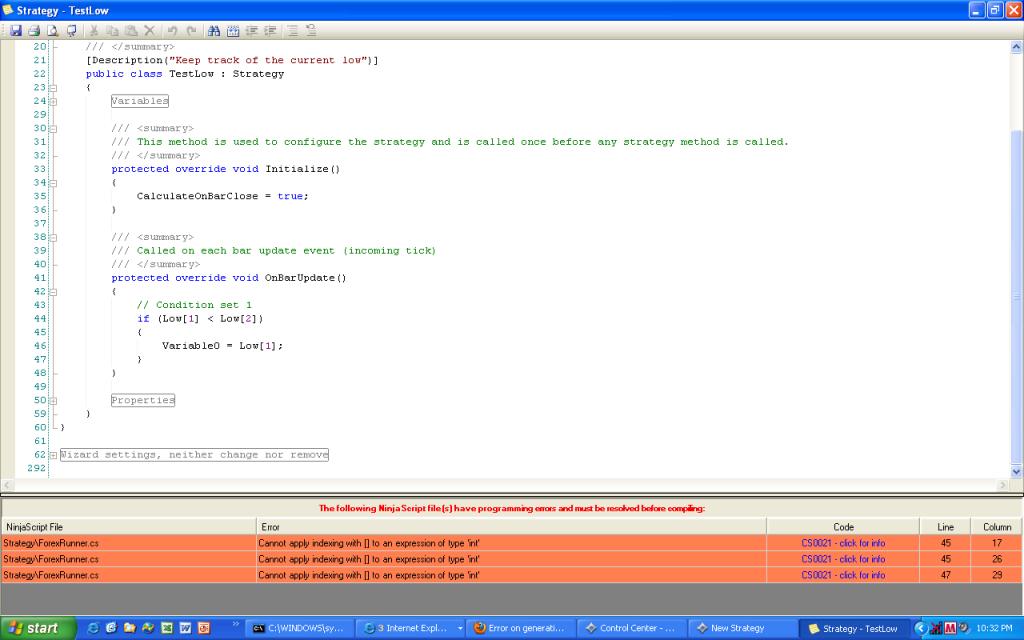 Part of a strategy I'm working on is to keep track the most recent low. I used the Wizard to set up the following, but get an error code CS0021 when trying to save. Here's the code-