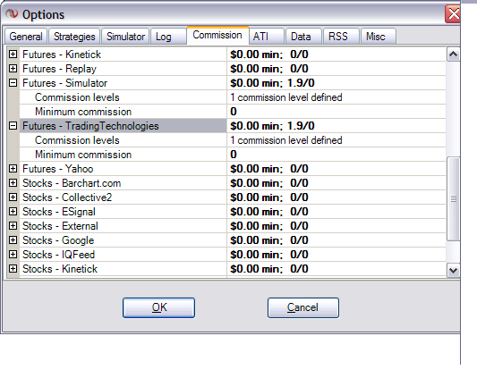 1) Control Center:Tools:Options:Commissions tab I added commissions for all account connection providers as well as "Simulator." I added commissions for futures, forex, and stocks.