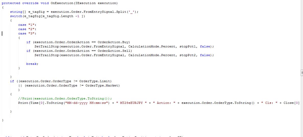 The OnOrderUpdate() and OnExecution() methods are reserved for experienced programmers. Instead of using Set() methods to submit stop-loss and profit target orders, you can submit and update them manually through the use of IOrder and IExecution objects in the OnOrderUpdate() and OnExecution() methods. The OnOrderUpdate()